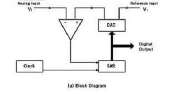 - 축차비교형 ADC는 SAR(successive Approximation Register)을 사용하여 최상위 비트로부터 순서대로 하위 비트 쪽으로 수정하여 가는 방법으로 DAC의 출력을 훨씬 빨리 아날로그 입력 전압에 근사시킨다.