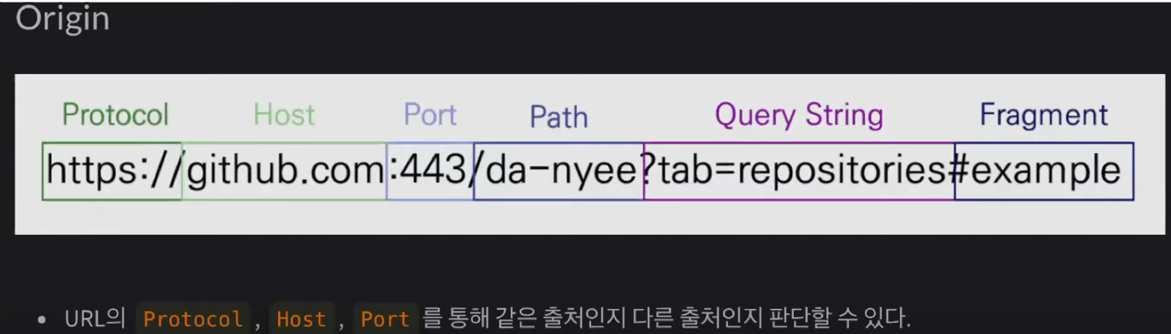 URL의 Protocol, Host, Port를 통해 같은 출처인지 다른 출처인지 판단한다.