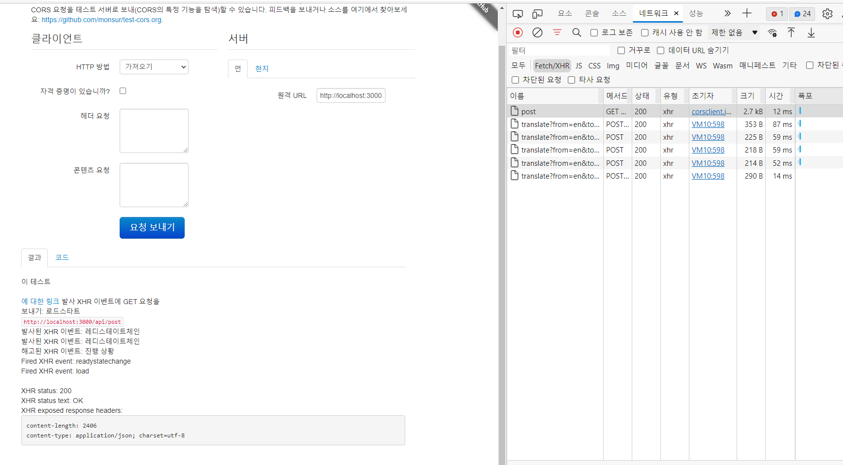 4) test-cors.org 에서 해결된 것 확인 다시 http://localhost:3000/api주소 에 요청했을때 아래와 같이 아무런 에러가 나지 않으면 해결된 것이다.