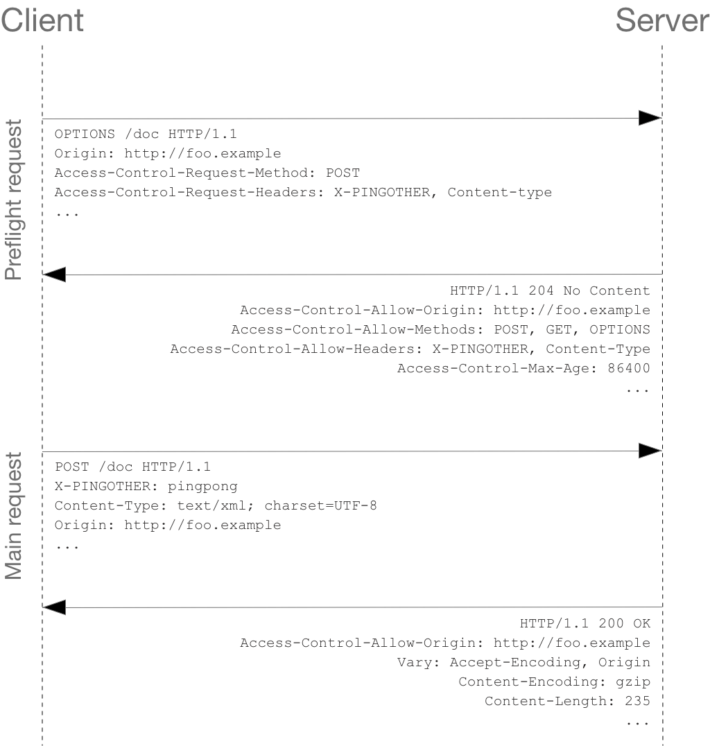 ②. 서버가 클라이언트 요청에 Preflight Response사전 응답을 한다. 여기서 요청이 거부가 되면 Actual Request는