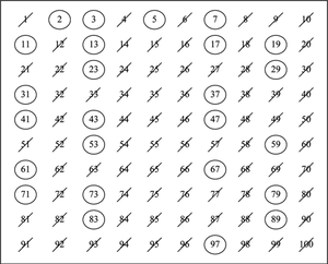 에라토스테네스의 체 : 범위에서 합성수를 지우는 방식으로 소수를 찾는 방법. 1. 1은 제거 2. 지워지지 않은 수 중 제일 작은 2를 소수로 채택하고, 나머지 2의 배수를 모두 지운다. 3. 지워지지 않은 수 중 제일 작은 3을 소수로 채택하고, 나머지 3의 배수를 모두 지운다. 4. 지워지지 않은 수 중 제일 작은 5를 소수로 채택하고, 나머지 5의 배수를 모두 지운다. 5. 지워지지 않은 수 중 제일 작은 7를 소수로 채택하고, 나머지 7의 배수를 모두 지운다. (반복)