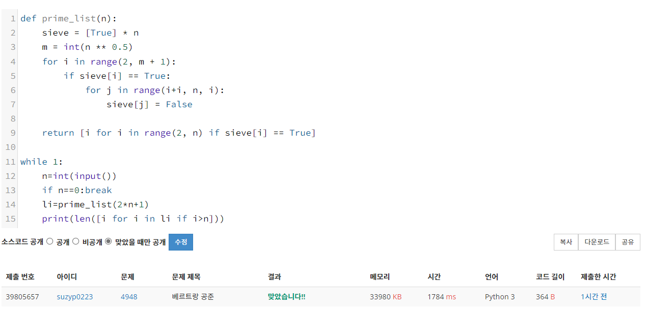 이 문제는 n이 주어지면 n보다 크고 2n보다 작은 소수의 개수를 구하는 문제이다. 시간을 절약하기 위해서 소수의 집합을 먼저 구하고서 while 반복문으로 테스트 케이스를 입력받았다. 코드에서 리스트와 집합을 생성할 대는 comprehension 표현식으로 작성하였다. 혹시라도 comprehension 표현식의 설명이 필요한 분을 위해 이전 포스팅을 링크 걸어둔다. ▶comprehension 표현식 사용 예시