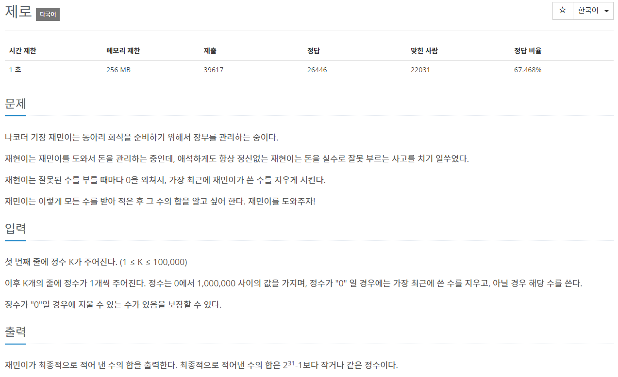항해 57일) (Python 3)백준 알고리즘 10773번 본문