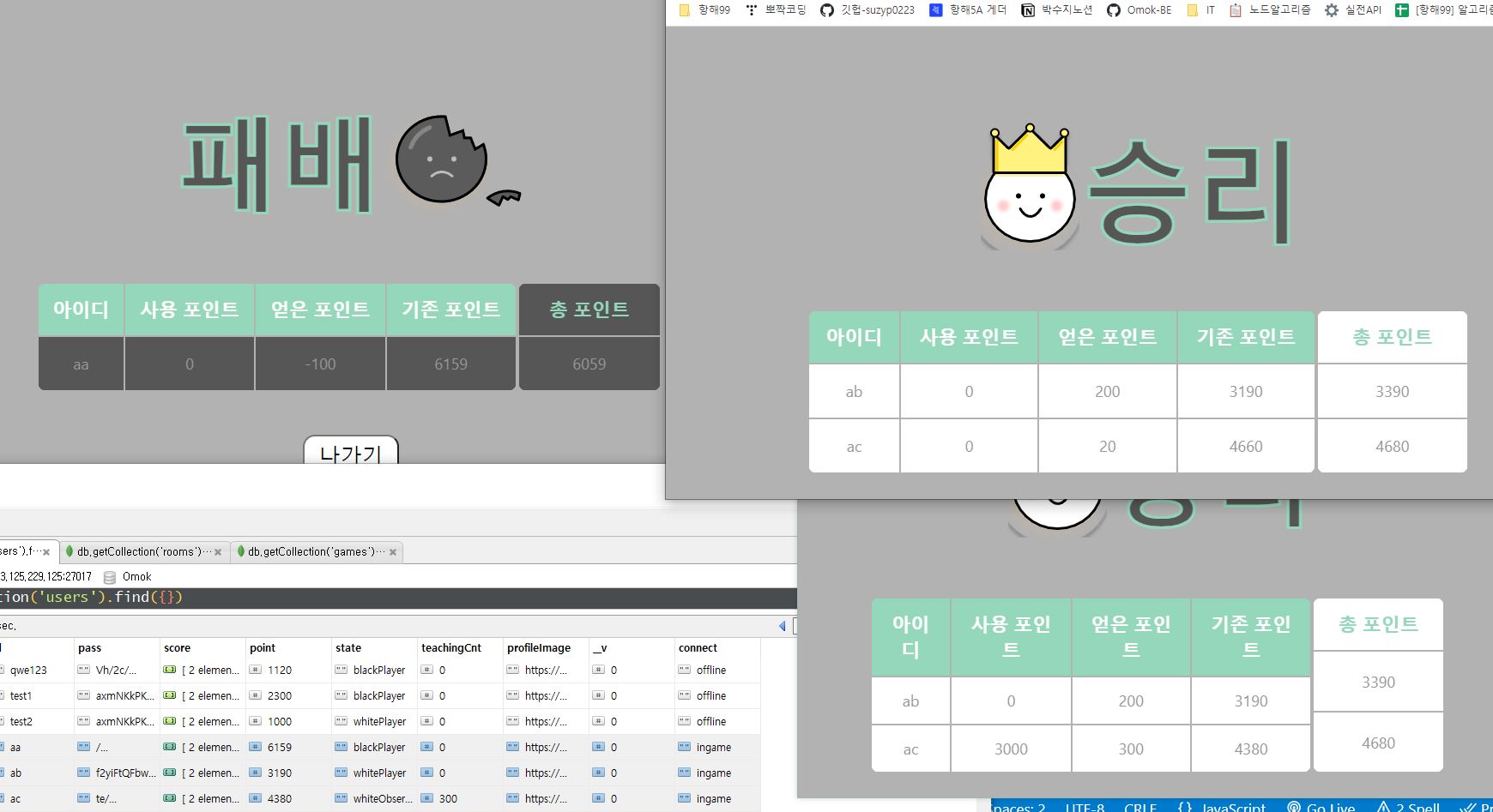 다만 이겼을때 플레이어와 옵저버의 결과창 점수가 조금씩 다른게 이상하다