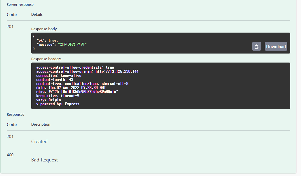 실패하면 아래와 같이 오류 메시지가 뜬다. 회원가입 API 테스트를 했고 2가지 실패 상황이 발생했다.