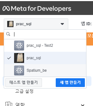‼‼페북은 http로는 테스트가 안된다. https로만 소셜로그인 가능하게 변경되었다. 그래서 테스트 계정을 따로 만들어야한다. 페북개발자홈피 > 내앱의 왼쪽 상단> 테스트 앱 만들기 클릭