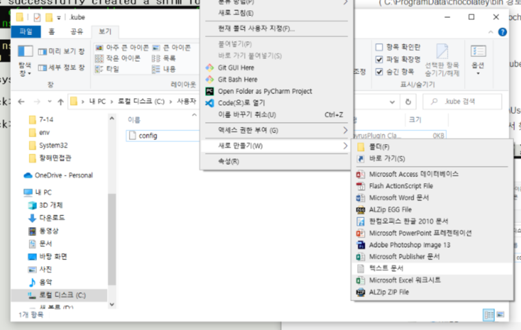 6). 내컴퓨터에서 .kube로 이동 ( C:\Users\Pack\.kube ). 확장자가 없는 config 텍스트파일을 만든다.
