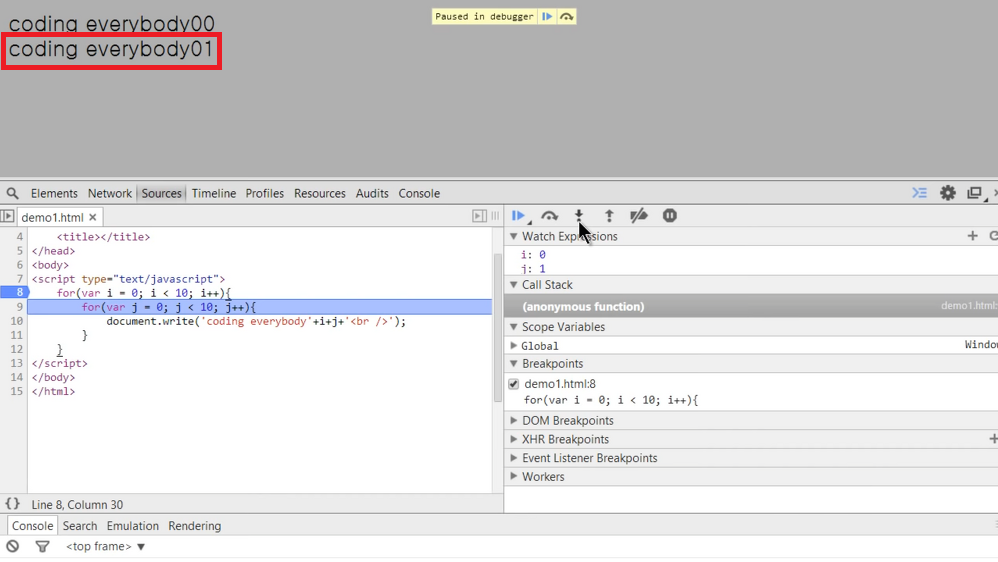 document.write('coding everybody' +i+j+'<br />');
