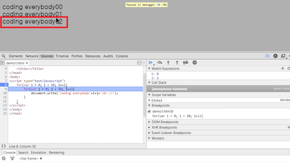 document.write('coding everybody' +i+j+'<br />');