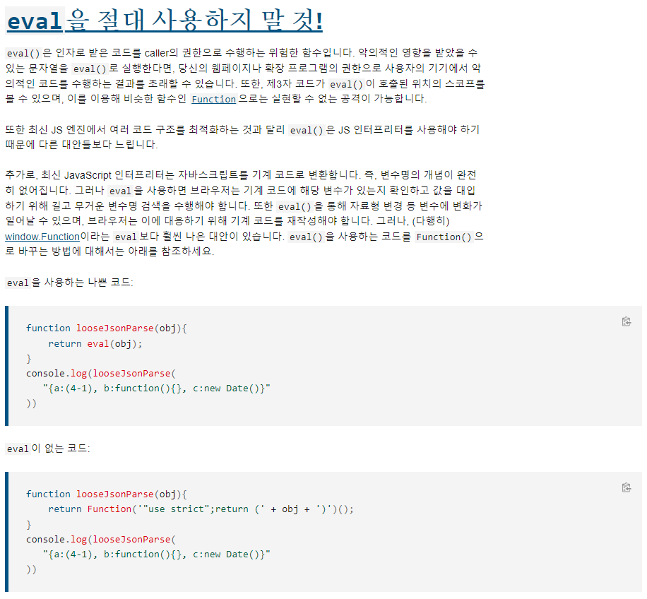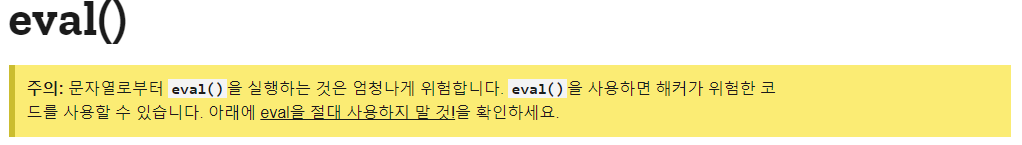모질라에 들어가 eval()을 검색하면 가장먼저 보이는 문구이다. 굉장히 흥미롭다. 자세한 사항은 아래 참고 링크를 통해 알수있다.