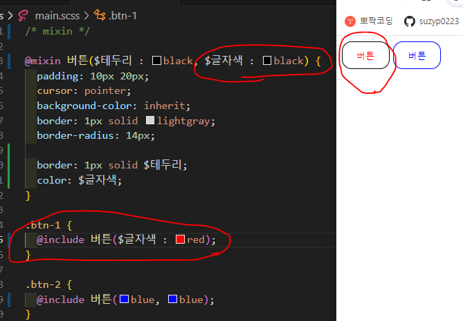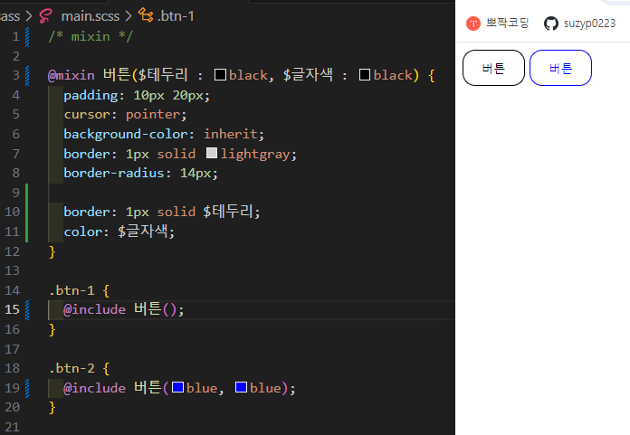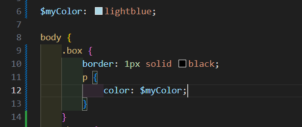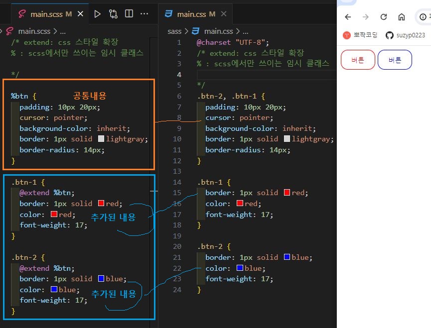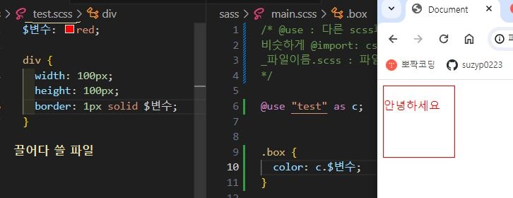 변수 : 변하는 수(숫자, 문자 등 모든 데이터 타입) 변수 선언 : $ + "변수명" : "저장할 내용"; $myColor: lightblue; 변수 사용 : color: $myColor;
