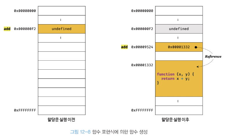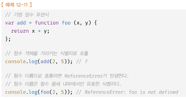 - 함수 이름은 함수 몸체 내부에서만 유효한 식별자이므로 함수 이름과는 별도로 생성된 함수 객체를 가리키는 식별자가 필요함. 식별자가 없으면 생성된 함수 객체를 참조할 수 없으므로 호출할 수도 없음.