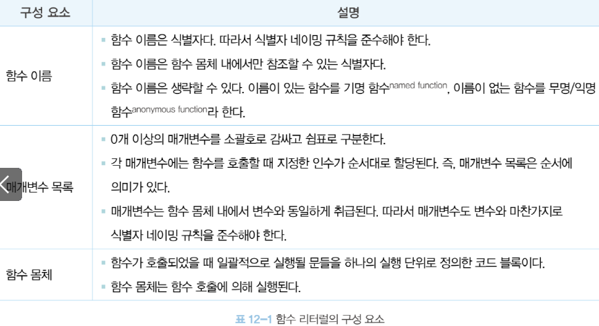 - 함수 리터럴은 function 키워드, 함수 이름, 매개변수 목록, 함수 몸체로 구성.
