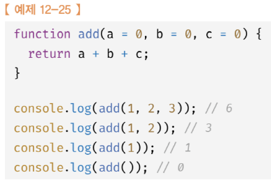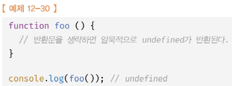 - 반환문은 생략 가능. 함수는 함수 몸체의 마지막문까지 실행한 후 암묵적을 로 undefined를 반환.