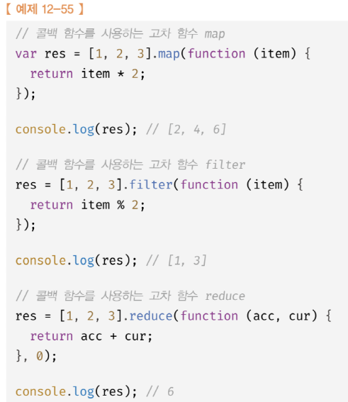 [예제 12-51]// 외부에서 전달받은 f를 n만큼 반복 호출.function repeat(n, f) {for (var i = 0; i < n; i++) {f(i); // i를 전달하면서 f를 호출}}var logAll = function (i) {console.log(i);};// 반복 호출할 함수를 인수로 전달.repeat(5, logAll); // 0 1 2 3 4var logOdds = function (i) {if (i % 2) console.log(i);};// 반복 호출할 함수를 인수로 전달.repeat(5, logOdds); // 1 3