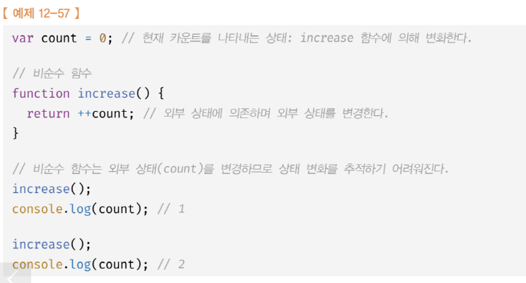 - 위 예제와 같이 인수를 전달받지 않고 함수 내부에서 외부 상태를 직접 참조하면 외부 상태에 의존하게 되어 반환값이 변할 수 있고, 외부 상태도 변경할 수 있으므로 비순수 함수가 됨.