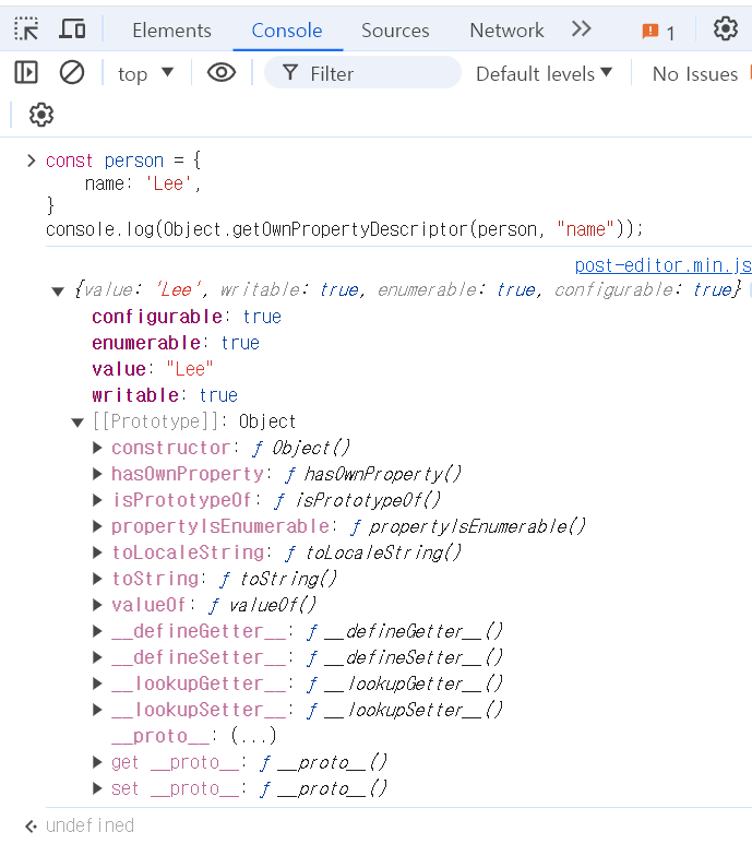 - 메서드가 반환된 프로퍼티 디스크립터 객체를 살펴보면 value 프로퍼티의 값은 'Lee'.