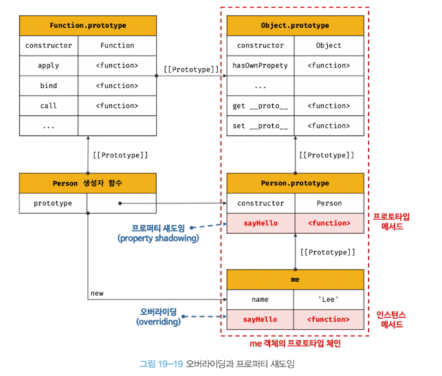 [예제 19-56]// 생성자 함수function Person(name) {this.name = name;}// 프로토타입 메서드Person.prototype.sayHello = function () {console.log(`Hi! My name is ${this.name}`);};// 정적 프로퍼티Person.staticProp = 'static prop';// 정적 메서드Person.staticMethod = function () {console.log('staticMethod');};const me = new Person('Lee');// 생성자 함수에 추가한 정적 프로퍼티/메서드는 생성자 함수로 참조/호출함.Person.staticMethod(); // staticMethod// 정적 프로퍼티/메서드는 생성자 함수가 생성한 인스턴스로 참조/호출할 수 없음.// 인스턴스로 참조/호출할 수 있는 프로퍼티/메서드는 프로토타입 체인 상에 존재해야 함.me.staticMethod(); // TypeError: me.staticMethod is not a function