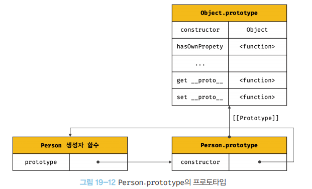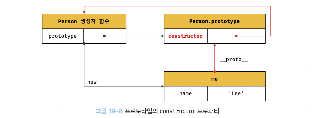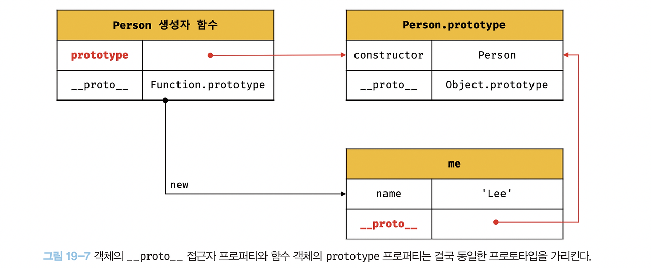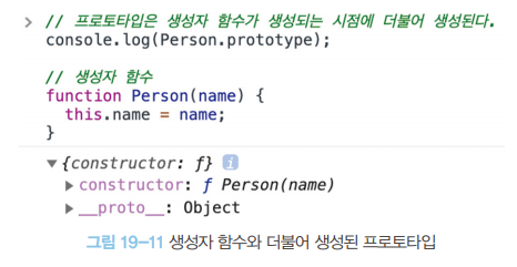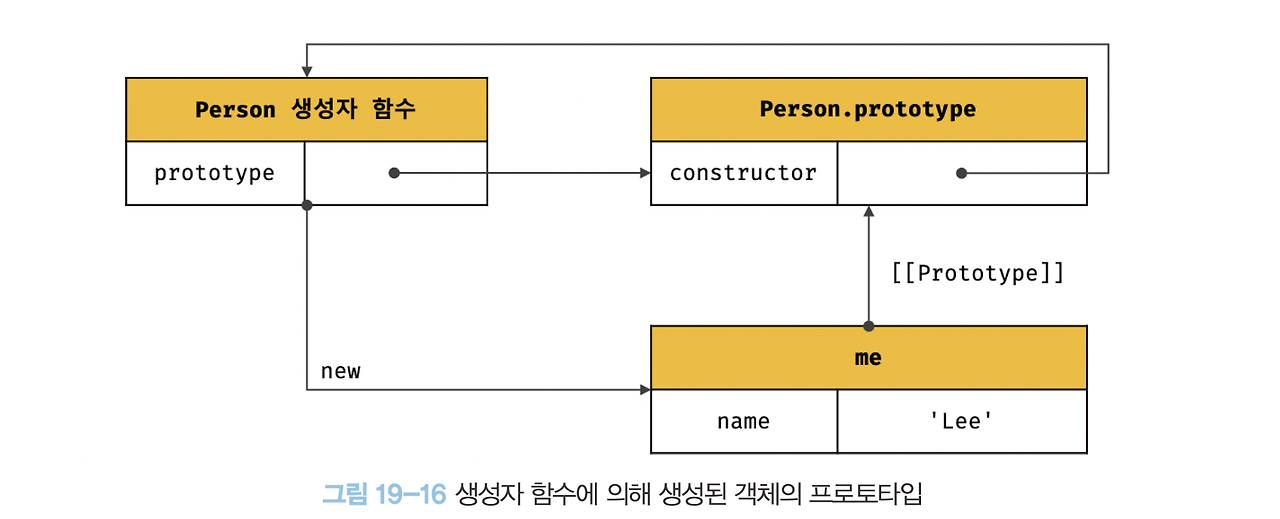 - 생성자 함수에 의해 생성된 객체의 프로토타입 : 생성자 함수의 prototype 프로퍼티에 바인딩되어 있는 객체.