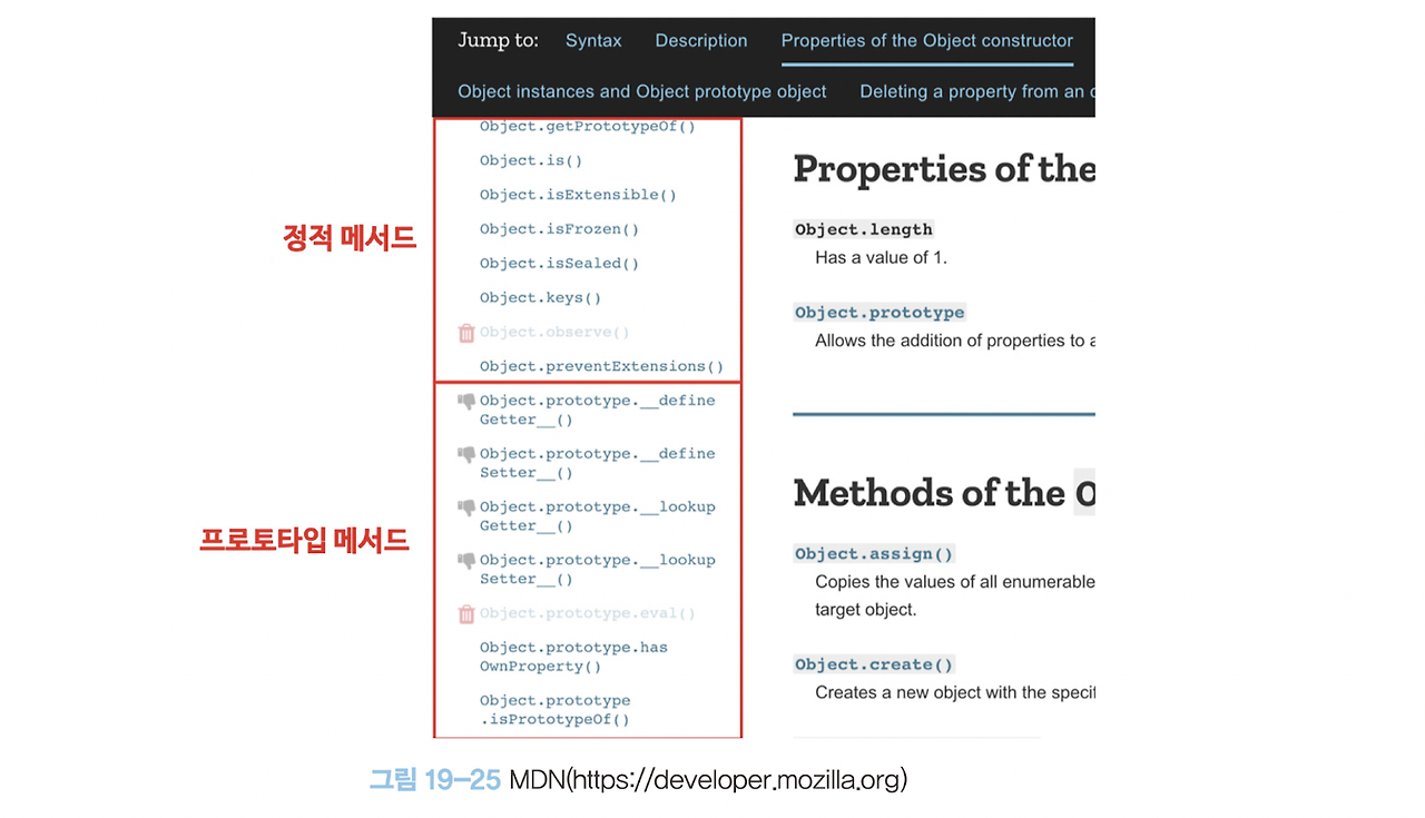 [예제 19-58]function Foo() { }// 프로토타입 메서드// this를 참조하지 않는 프로토타입 메소드는 정적 메서드로 변경해도 동일한 효과를 얻을 수 있음.Foo.prototype.x = function () {console.log('x');};const foo = new Foo();// 프로토타입 메서드를 호출하려면 인스턴스를 생성해야 함.foo.x(); // x// 정적 메서드Foo.x = function () {console.log('x');};// 정적 메서드는 인스턴스를 생성하지 않아도 호출할 수 있음.Foo.x(); // x