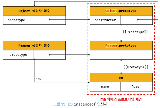 - 생성자 함수가 생성한 인스턴스는 자신의 프로토타입 체인에 속한 객체의 프로퍼티/메서드에 접근할 수 있음.