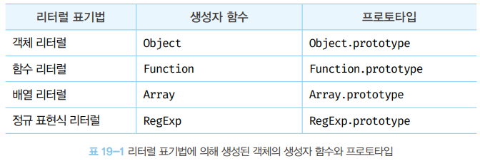 [예제 19-03]// 생성자 함수function Circle(radius) {this.radius = radius;this.getArea = function () {// Math.PI는 원주율을 나타내는 상수return Math.PI * this.radius ** 2;};}// 반지름이 1인 인스턴스 생성const circle1 = new Circle(1);// 반지름이 2인 인스턴스 생성const circle2 = new Circle(2);// Circle 생성자 함수는 인스턴스를 생성할 때마다 동일한 동작을 하는// getArea 메서드를 중복 생성하고 모든 인스턴스가 중복 소유.// getArea 메서드는 하나만 생성하여 모든 인스턴스가 공유해서 사용하는 것이 바람직.console.log(circle1.getArea === circle2.getArea); // falseconsole.log(circle1.getArea()); // 3.141592653589793console.log(circle2.getArea()); // 12.566370614359172