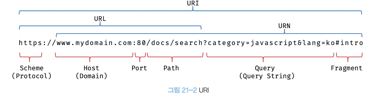 - URI는 인터넷에 있는 자원을 나타내는 유일한 주소를 말함. URI의 하위개념으로 URL, URN이 있음.