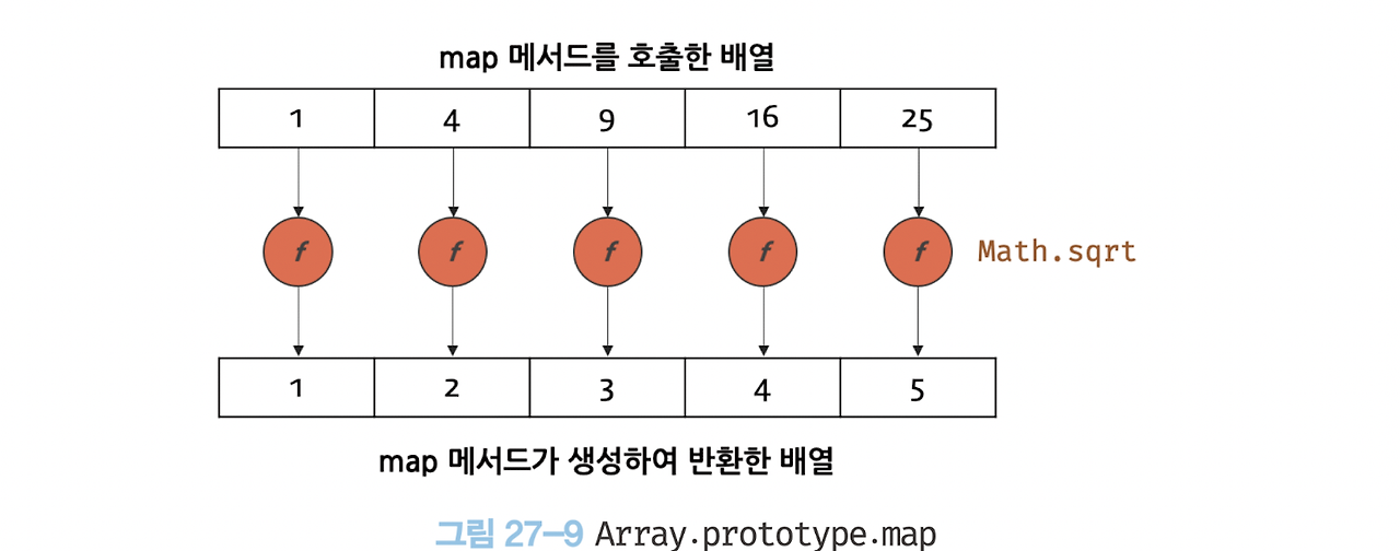 [예제 27-133]const arr = ['hello', 'world'];// map과 flat을 순차적으로 실행arr.map(x => x.split('')).flat();// -> ['h', 'e', 'l', 'l', 'o', 'w', 'o', 'r', 'l', 'd']// flatMap은 map을 통해 생성된 새로운 배열을 평탄화한다.arr.flatMap(x => x.split(''));// -> ['h', 'e', 'l', 'l', 'o', 'w', 'o', 'r', 'l', 'd']