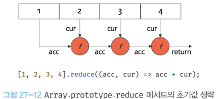 [예제 27-113]// [1, 2, 3, 4]의 모든 요소의 누적을 구한다.const sum = [1, 2, 3, 4].reduce((accumulator, currentValue, index, array) => accumulator + currentValue, 0);console.log(sum); // 10