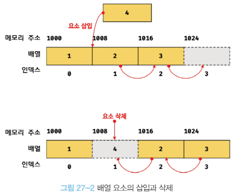 - 배열에 요소를 삽입하거나 삭제하는 경우 배열의 요소를 연속적으로 유지하기 위해 요소를 이동시켜야 함.