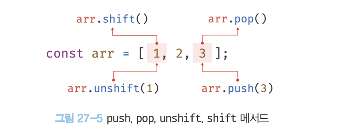 [예제 27-07]const arr = [1, 2, 3];// 반복문으로 자료 구조를 순서대로 순회하기 위해서는 자료 구조의 요소에 순서대로// 접근할 수 있어야 하며 자료 구조의 길이를 알 수 있어야 한다.for (let i = 0; i < arr.length; i++) {console.log(arr[i]); // 1 2 3}