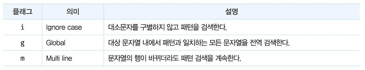 - 패턴과 함께 정규 표현식을 구성하는 플래그는 정규 표현식의 검색 방식을 설정하기 위해 사용.