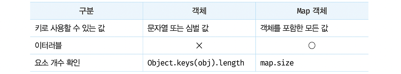Map 객체는 키와 값의 쌍으로 이루어진 컬렉션. Map 객체는 객체와 유사하지만 다음과 같은 차이가 있음.