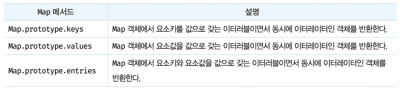 - Map 객체는 이터러블이면서 동시에 이터레이터인 객체를 반환하는 메서드를 제공함.