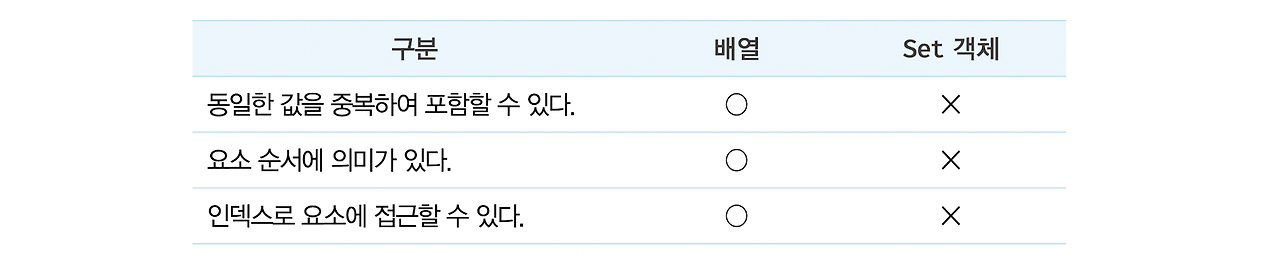 - Set 객체는 중복되지 않는 유일한 값들의 집합. Set 객체는 배열과 유사하지만 다음과 같은 차이가 있음.