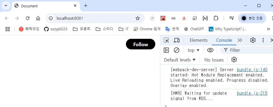 웹팩실행 명령어 - 코드 변화가 있을때 마다 다시 명령어 실행해 번들링을 다시 해야함.