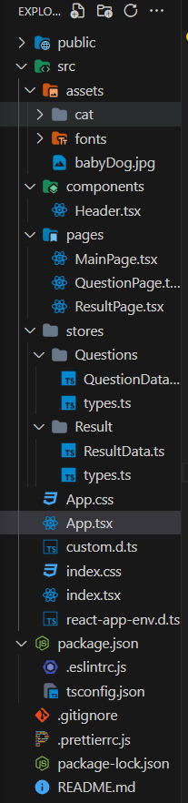 - Route: 각 URL 경로에 대해 어떤 컴포넌트를 보여줄지 정의하는 컴포넌트. 예, / 경로에 대해 MainPage, /question 경로에 대해 Question, /result 경로에 대해 Result 컴포넌트를 렌더링.