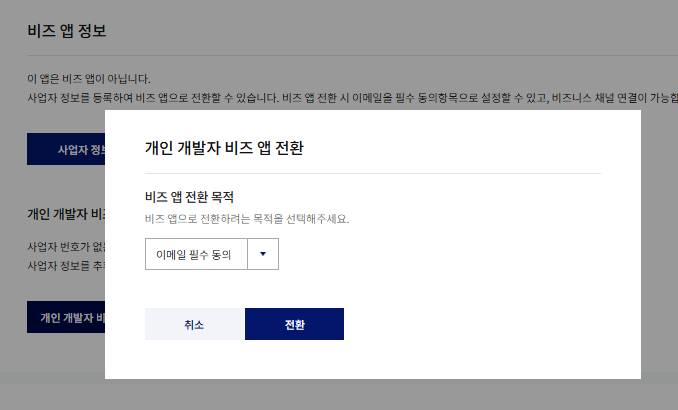 내 애플리케이션 > 앱 설정 > 비지니스 > 개인 개발자 비즈 앱 전환