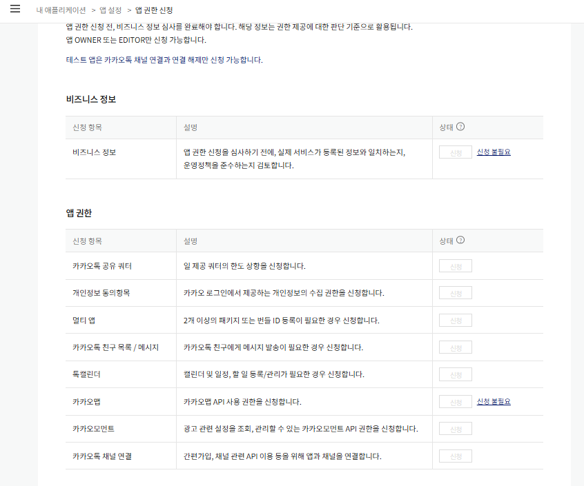 내 애플리케이션 > 제품 설정> 앱 권한 신청