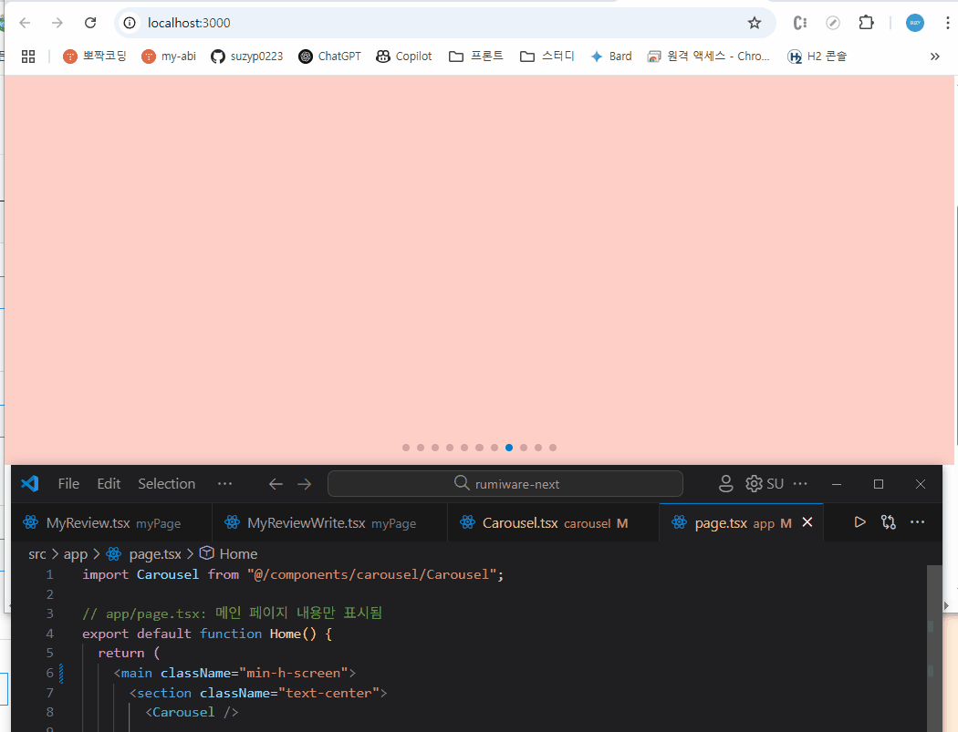 처음에 잘 나오던 메인 홈페이지 캐러셀이 작업중간 부터 렌더링후 배경색만 나오는 오류가 생겼다.