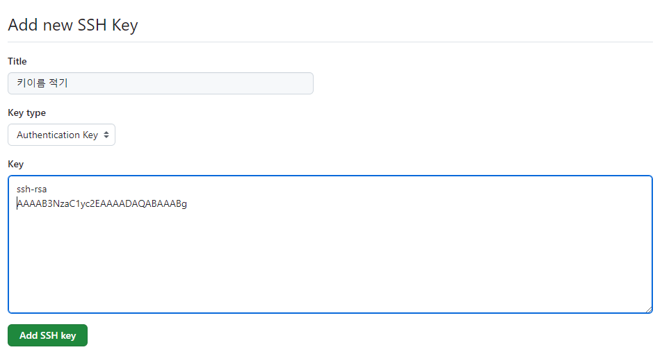 플필에 Settings > SSH and GPG keys > New SSH key